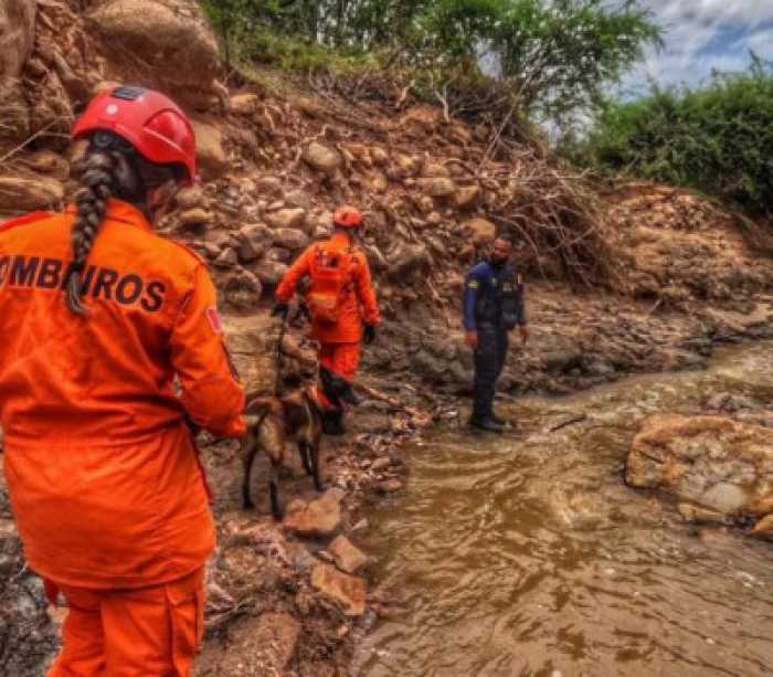 Cão farejador do Corpo de Bombeiros auxilia buscas por homem desaparecido após fortes chuvas em Piranhas